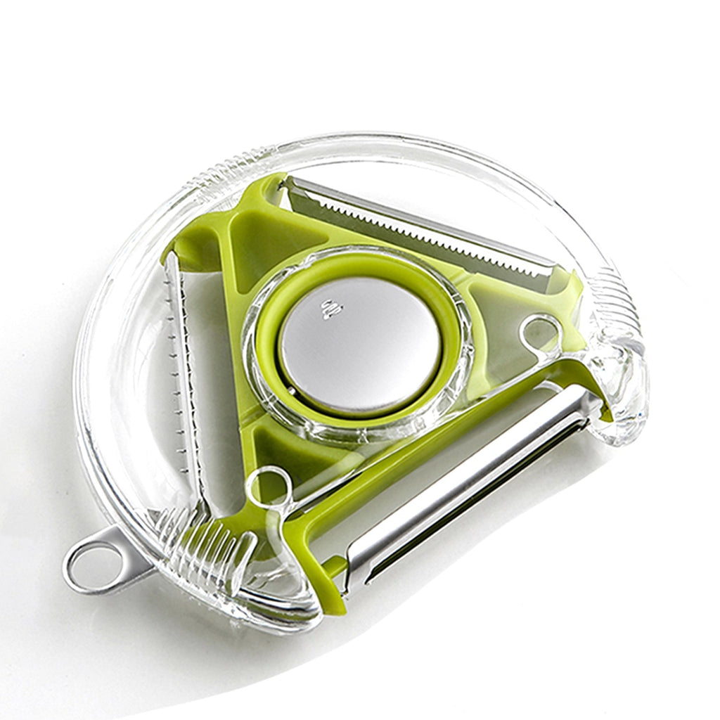 • Compact Rotary Peeler, Vegetable Skin Peeler, Serrated Blade for Peeling Skin of Tomatoes, Stainless Steel Blades and Plastic Body, Easy Rotation of Blades Vegetable & Fruit Slicer. The peeler blades are made of stainless steel, sharp enough and not easy to rust. With the plastic sleeve it will protect your hands.